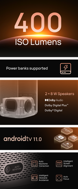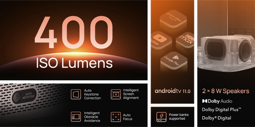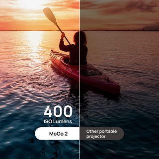 MoGo 2 was designed for fun-filled home entertainment whenever you need it. Featuring a bright 400 ISO lumens, the highest in its class, D65 color temperature standard used in Hollywood, premier built-in surround sound speakers, and our ISA 1.0 technology, MoGo 2 delivers a professional visual experience in a small build but in a big way!